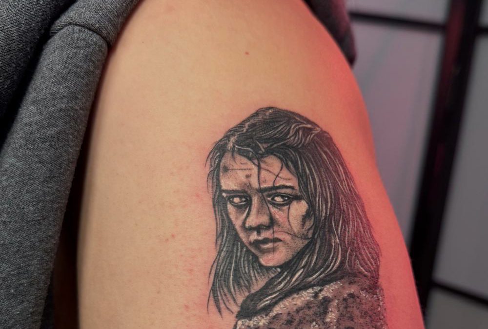 Este tatuaje en realismo captura la intensidad y la esencia de Arya Stark, uno de los personajes más icónicos de Game of Thrones. Con detalles sombreados y un efecto desgastado, esta pieza representa la fuerza y la resiliencia con su icónica frase: «Not today».