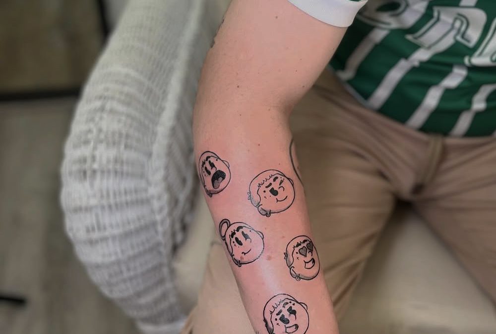 Este tatuaje en estilo cartoon plasma una serie de expresiones faciales con trazos simples pero llenos de carácter. Un diseño divertido y creativo que juega con la espontaneidad y el arte minimalista del dibujo animado.
