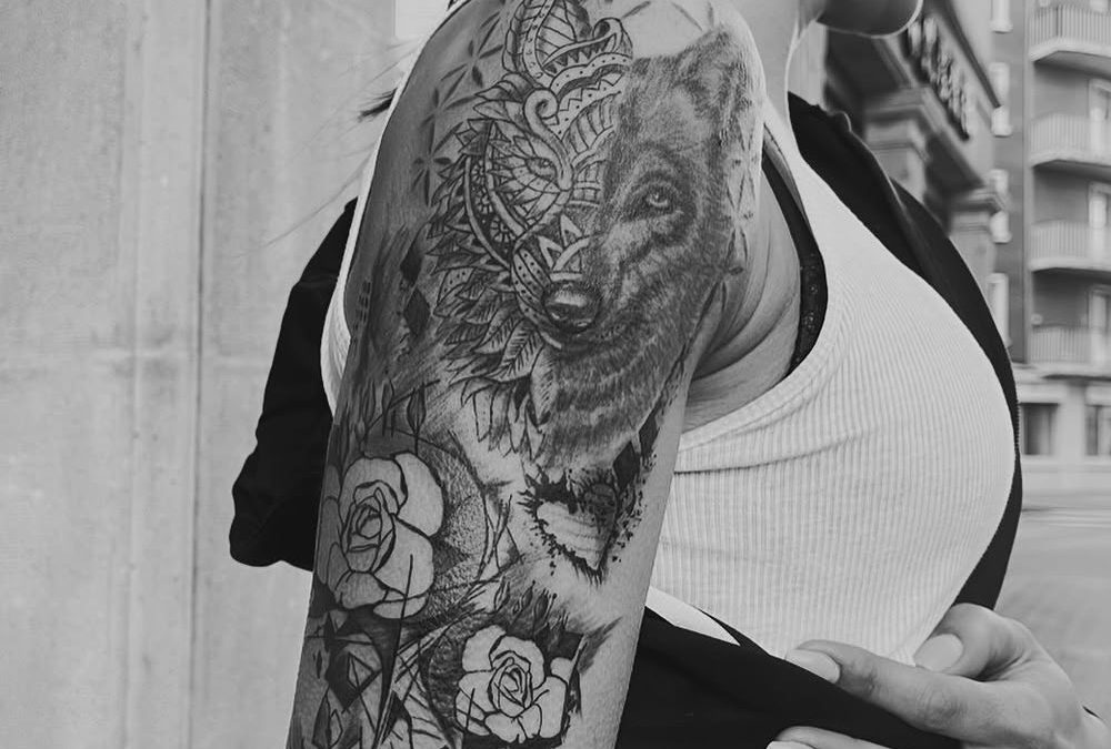 Este impactante diseño de lobo fusiona el realismo con detalles geométricos y elementos florales, creando una pieza única y llena de simbolismo. Un tatuaje que representa la conexión con la naturaleza y la fuerza interior.