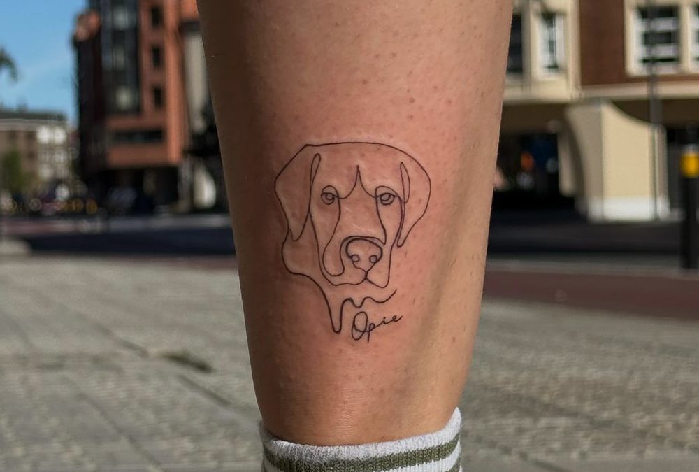 Este tatuaje en línea fina captura la esencia de un fiel compañero con un trazo limpio y minimalista. Un diseño elegante y simbólico que refleja amor y conexión eterna con tu mascota.