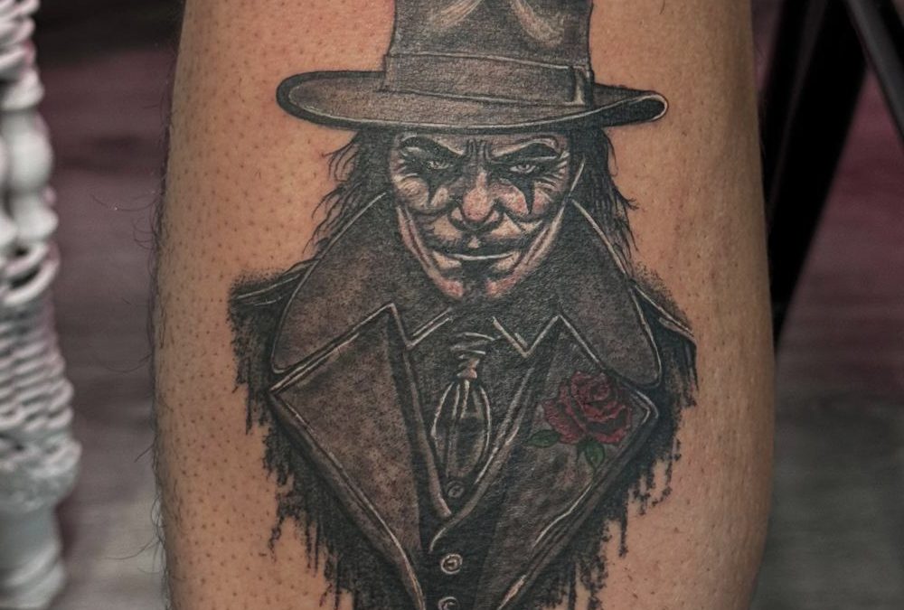 Este tatuaje en realismo captura la intensidad del icónico personaje de V de Venganza. Con un juego de sombras profundas y detalles minuciosos, esta pieza refleja la lucha por la libertad y la justicia. La rosa roja aporta un contraste sutil pero poderoso, simbolizando la resistencia y la pasión.
