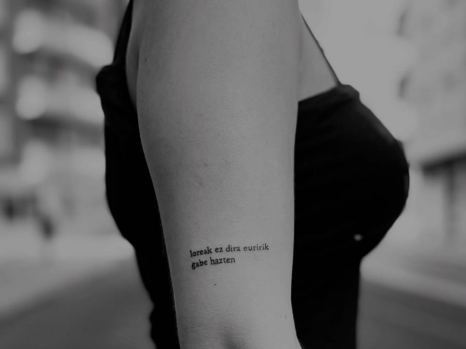 Este tatuaje en lettering presenta una frase en euskera con un significado profundo: «Las flores no crecen sin lluvia». Un diseño minimalista y elegante que encapsula la idea de crecimiento a través de la adversidad, con una tipografía sutil y bien equilibrada.